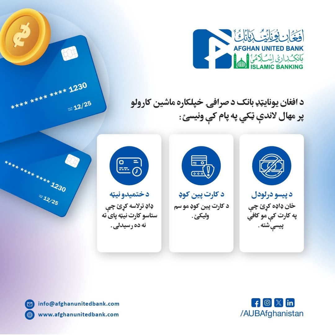 نور ولولئد افغان یونایتد بانک د ATM کارټونو لرونکي کولی شي په افغانستان کې ۲۴/۷ بانکي معاملات ترسره کړي. افغان یونایتد بانک اوس مهال په
